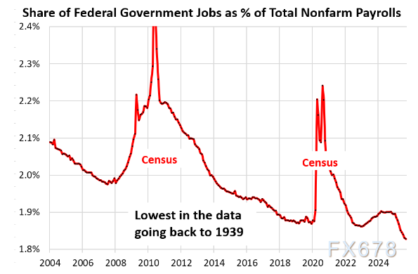 联邦政府就业人数占总就业人数的比例降至1.82%,为1939年有数据记录以来的最低水平。