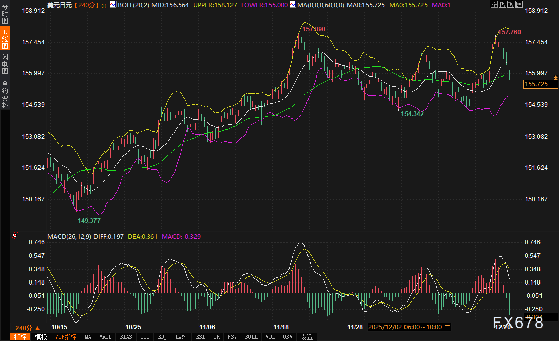 汇通财经APP讯——周二(12月23日),美元兑日元交易于155.984附近,日内下跌0.66%。市场在上周日本央行历史性加息后陷入整理,一方面消化政策声明中的鹰派内核,另一方面则在评估全球债券市场抛售暂停及年末流动性减弱带来的影响。汇价目前徘徊于关键技术水平附近,多空双方在基本面预期与技术面信号间寻找新的平衡点。
